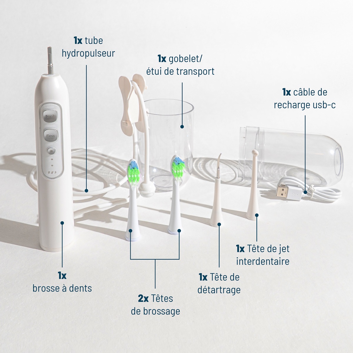 - Modes de fonctionnement : Jet dentaire et brosse à dents (2 modes chacun, avec 2 niveaux de pression)