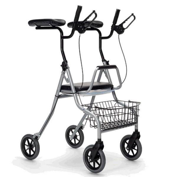 Déambulateur avec appuis antébrachiaux pliant, confortable et sécurisé. Freins progressifs, siège, panier amovible et plateau plexiglas pour plus d’autonomie.