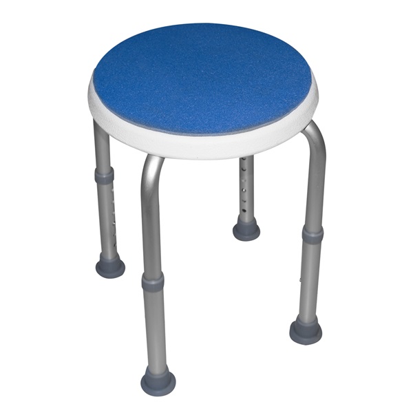 Tabouret de douche réglable en hauteur avec assise recouverte d’un coussinet souple pour un meilleur confort et éviter tout glissement.