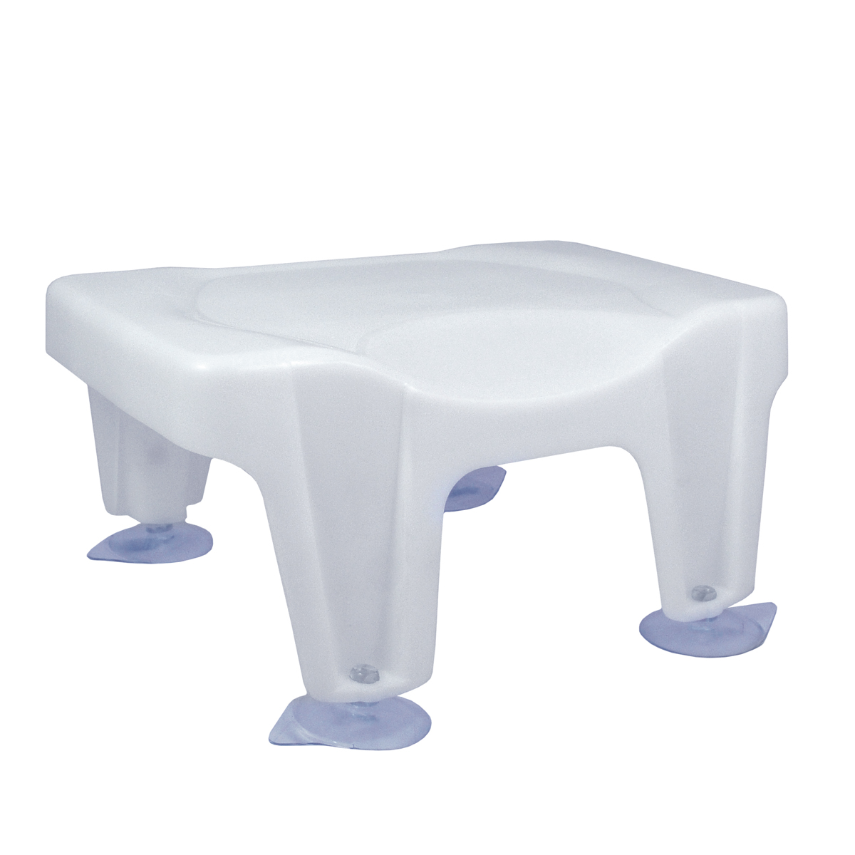 Tabouret en plastique moulé avec encoche pour l’écoulement de l’eau. Très stable grâce à ses ventouses de sécurité et facile à nettoyer.